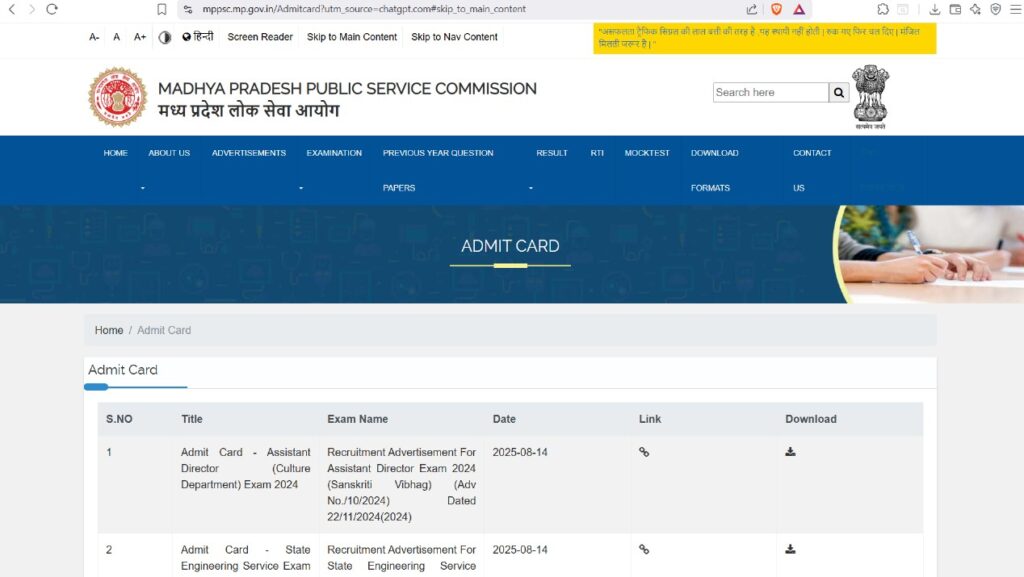 Big Update: MPPSC SES Admit Card 2025 Out—Download Hall Ticket for Aug 24 Exam
